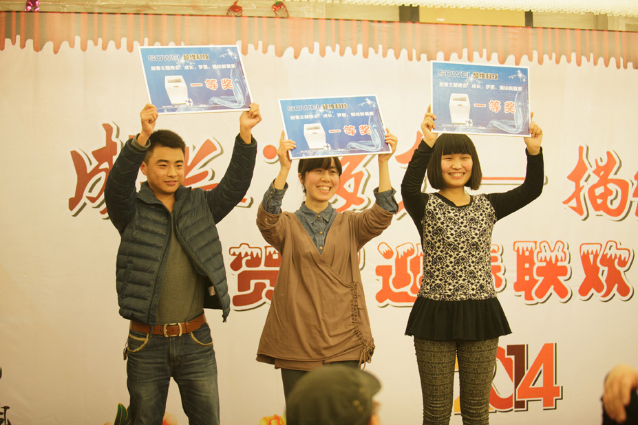隨著三等獎、二等獎、一等獎的抽取不斷掀起年會的高潮。公司領(lǐng)導與員工親情互動、激動人心的抽獎活動,讓歌聲、掌聲、歡呼聲一直在會場上蕩漾。